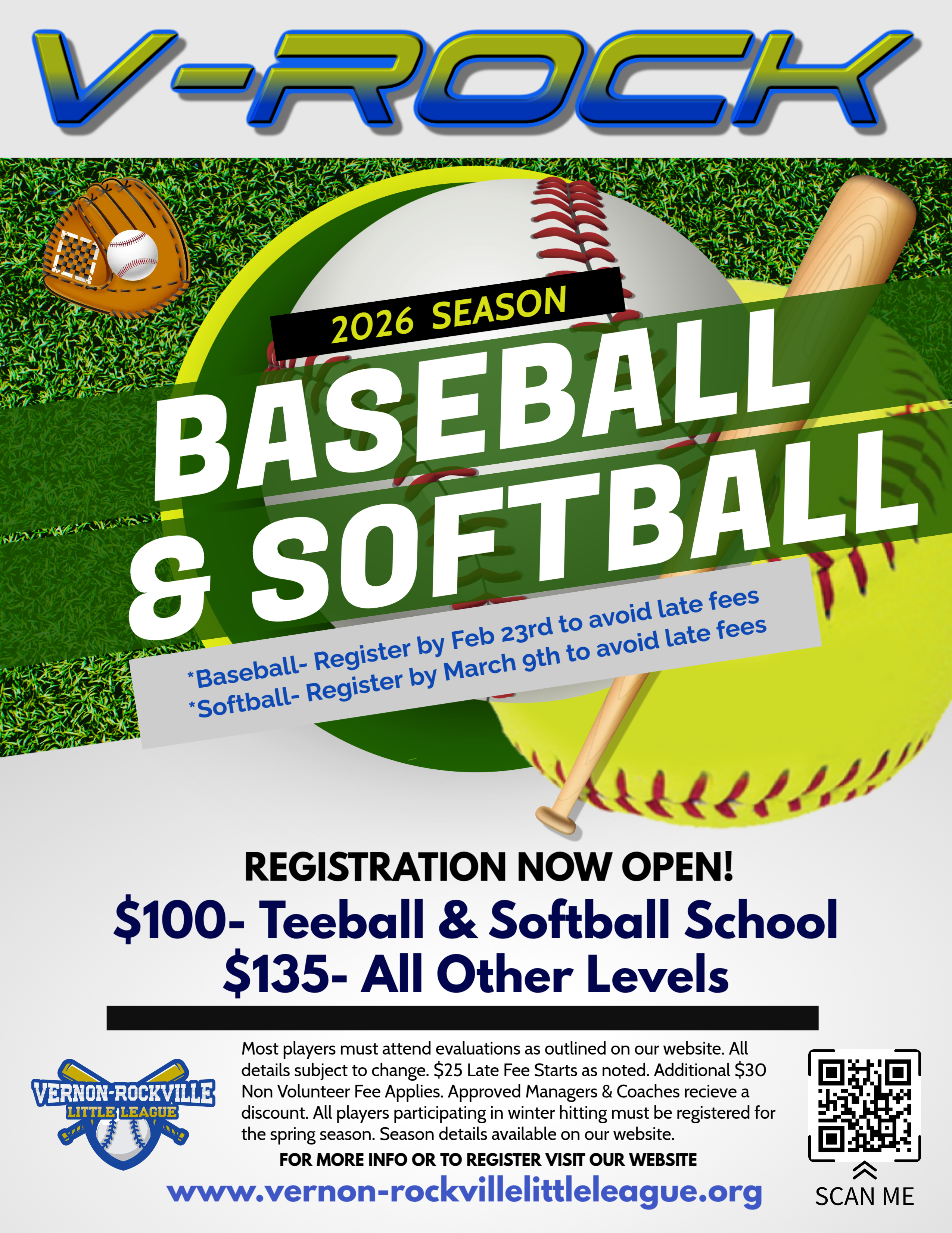 We will be conducting evaluations inside on February 21st and 22nd in the gym at Vernon Center Middle School. For baseball, only players league age 8 and up (as of 8/31/2025) need to evaluate.